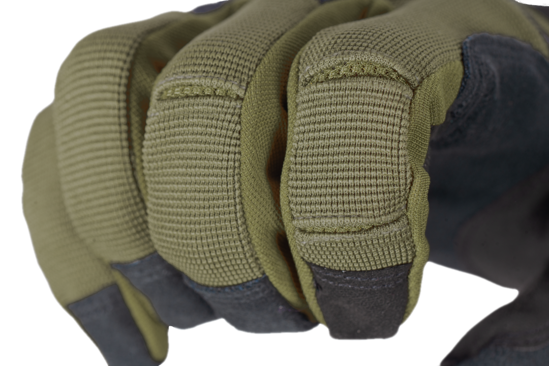 • The knuckle area is padded with foam to help lessen impacts. On the back of the hand and between each finger is a stretchy material to maximize mobility.