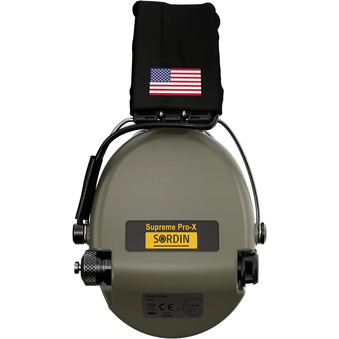 • This Sordin Supreme Pro-X features a custom headband printed by us with the US Flag on the right and USA on the left side.